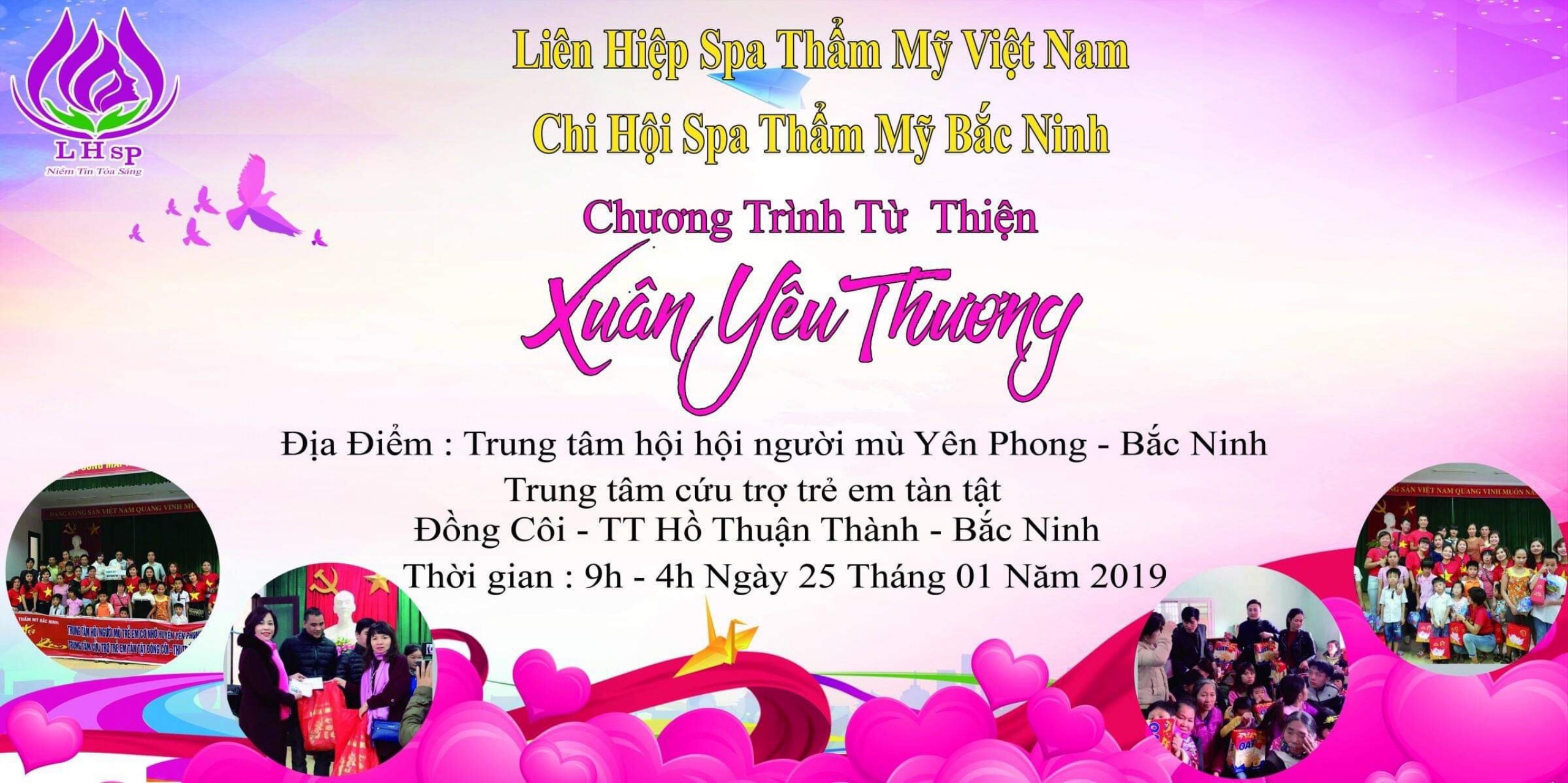 XUÂN YÊU THƯƠNG là chương trình được tổ chức bởi Chi hội spa thẩm mỹ Bắc Ninh thuộc Liên hiệp spa thẩm mỹ Việt Nam tại hai trung tâm: "Trung tâm hội nguời mù Yên Phong - Bắc Ninh và Trung tâm cứu trợ trẻ em tàn tật Đông Côi- TT Hồ- Thuận Thành - Bắc Ninh" vào lúc 9h - 4h ngày 25/1/2019 .