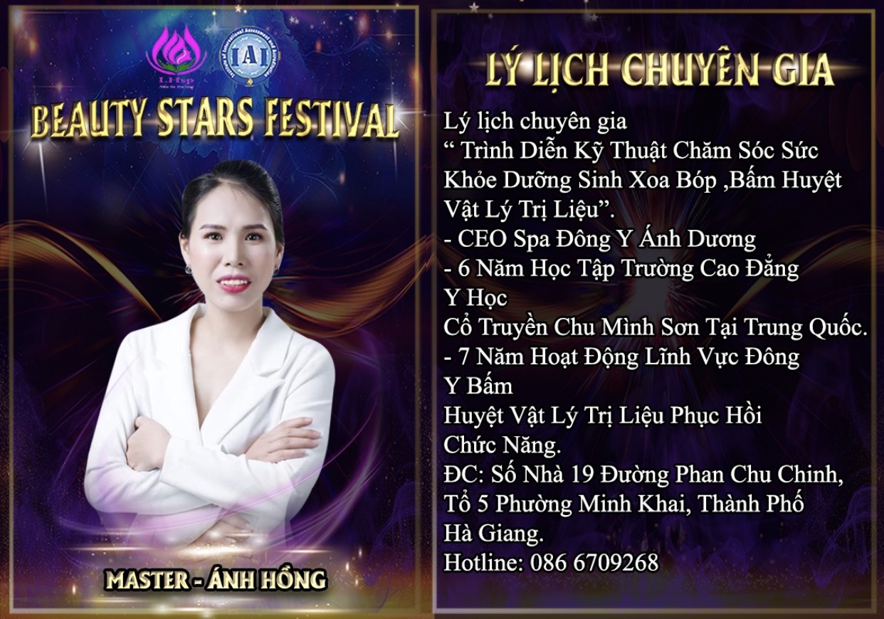 Hãy cùng đón chờ sự xuất hiện của chuyên gia Lục Ánh Hồng trong sự kiện Beauty Stars Festival đẳng cấp này nhé với màn trình diễn “Kỹ thuật chăm sóc sức khỏe dưỡng sinh xoa bóp, bấm huyệt vật lý trị liệu” nhé!