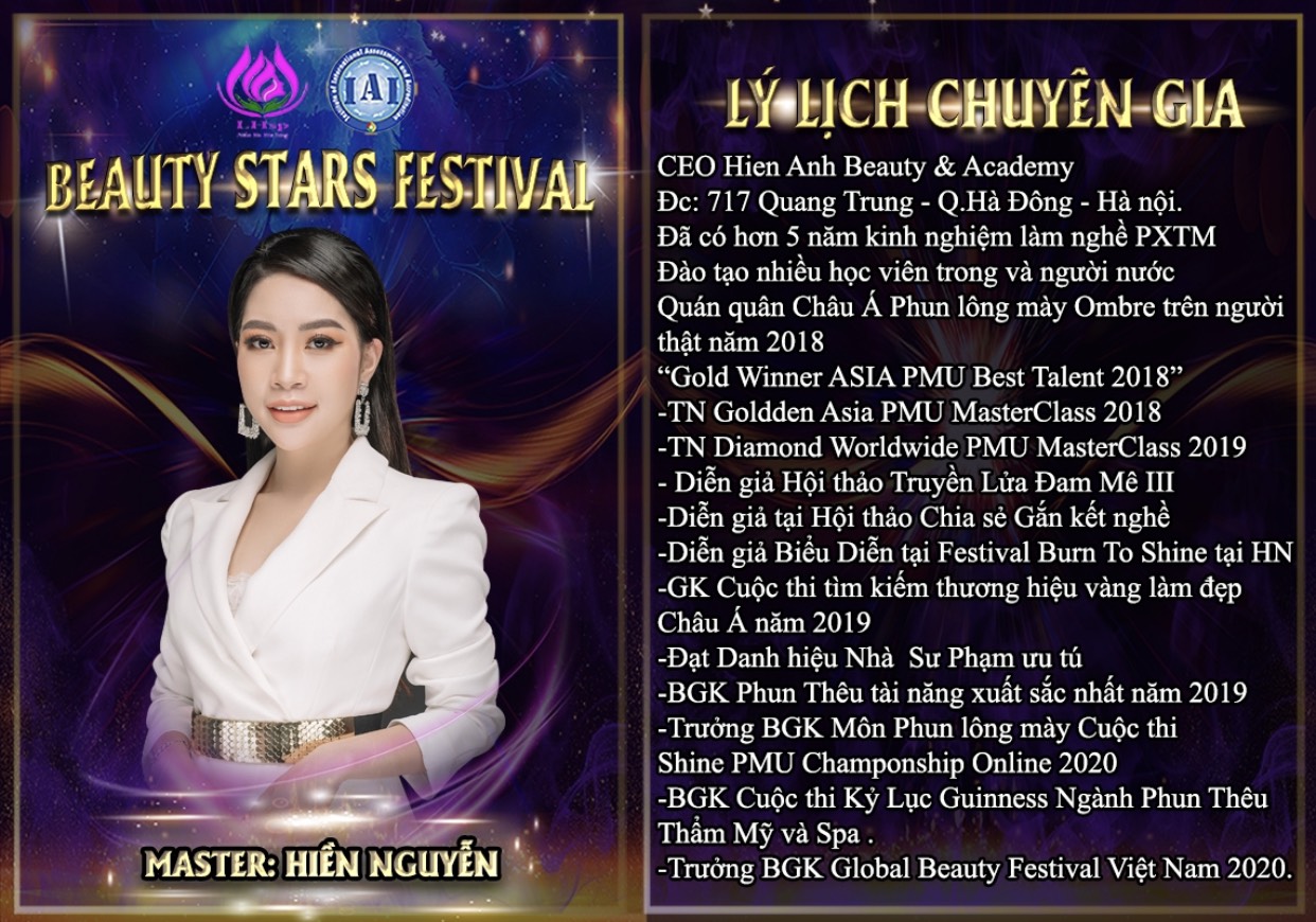 Đến với sự kiện Beauty Stars Festival diễn ra vào ngày 09/11/2020 tại Hà Nội, Hiền Nguyễn cùng với hơn 30 chuyên gia làm đẹp đến từ nhiều lĩnh vực như spa, thẩm mỹ, nail, thiết kế tạo mẫu tóc, trang điểm,... hứa hẹn sẽ cùng nhau tạo nên một sự kiện đáng nhớ, chuyên nghiệp, đẳng cấp và độc đáo nhất ngành làm đẹp trong năm 2020.