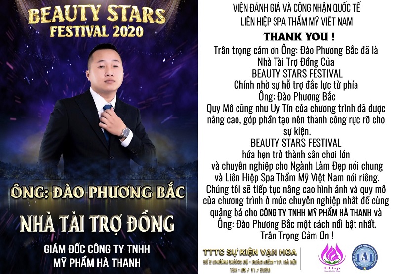 Công ty TNHH Mỹ phẩm Hà Thanh - Đại diện là ông Đào Phương Bắc chính thức trở thành nhà tài trợ đồng cho cuộc thi Beauty Stars Festival – sự kiện đẳng cấp, quy mô được tổ chức bởi Liên hiệp Spa Thẩm mỹ Việt Nam.