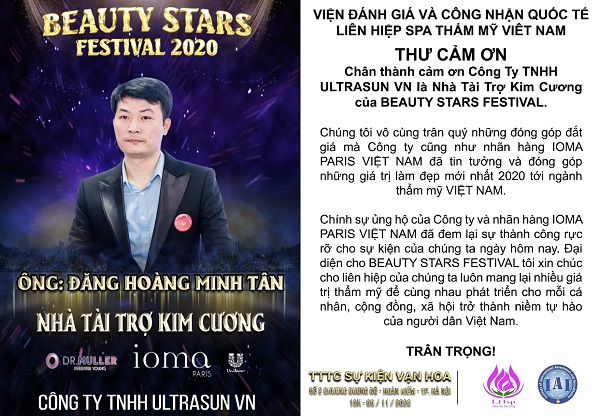 Công ty TNHH Ultrasun VN – người đại diện Đăng Hoàng Minh Tân đã trở thành nhà tài trợ kim cương tại sự kiện quy mô của ngành Làm đẹp – Beauty Stars Festival. Với sự đóng góp của mình, chắc chắn Ultrasun Vietnam (DrMuller VN) cùng nhãn hàng IOMA Paris sẽ giúp tạo nên một sự kiện đẳng cấp, chuyên nghiệp.