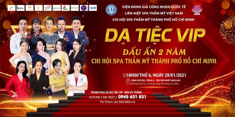 Tới đây vào thứ 6 ngày 29/01/2021, sẽ diễn ra Dạ Tiệc VIP Dấu ấn 2 năm của Chi hội Spa thẩm mỹ TP Hồ Chí Minh. Chương trình được tổ chức bởi Viện đánh giá công nhận Quốc tế, Liên hiệp Spa thẩm mỹ Việt Nam và Chi hội Spa thẩm mỹ TP HCM.