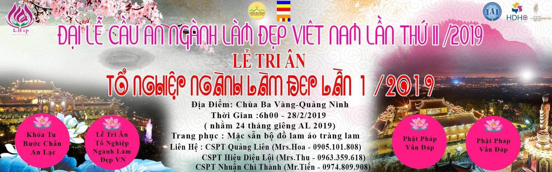 Trân trọng kính mời Cộng đồng làm đẹp Việt Nam tham dự chương trình: "Đại lễ cầu an Ngành làm đẹp Việt Nam lần thứ hai"được tổ chức tại Chùa Ba vàng tỉnh Quảng Ninh.Và đồng thời tổ chức " Lễ tri ân tổ nghiệp Ngành làm đẹp lần thứ nhất năm 2019"