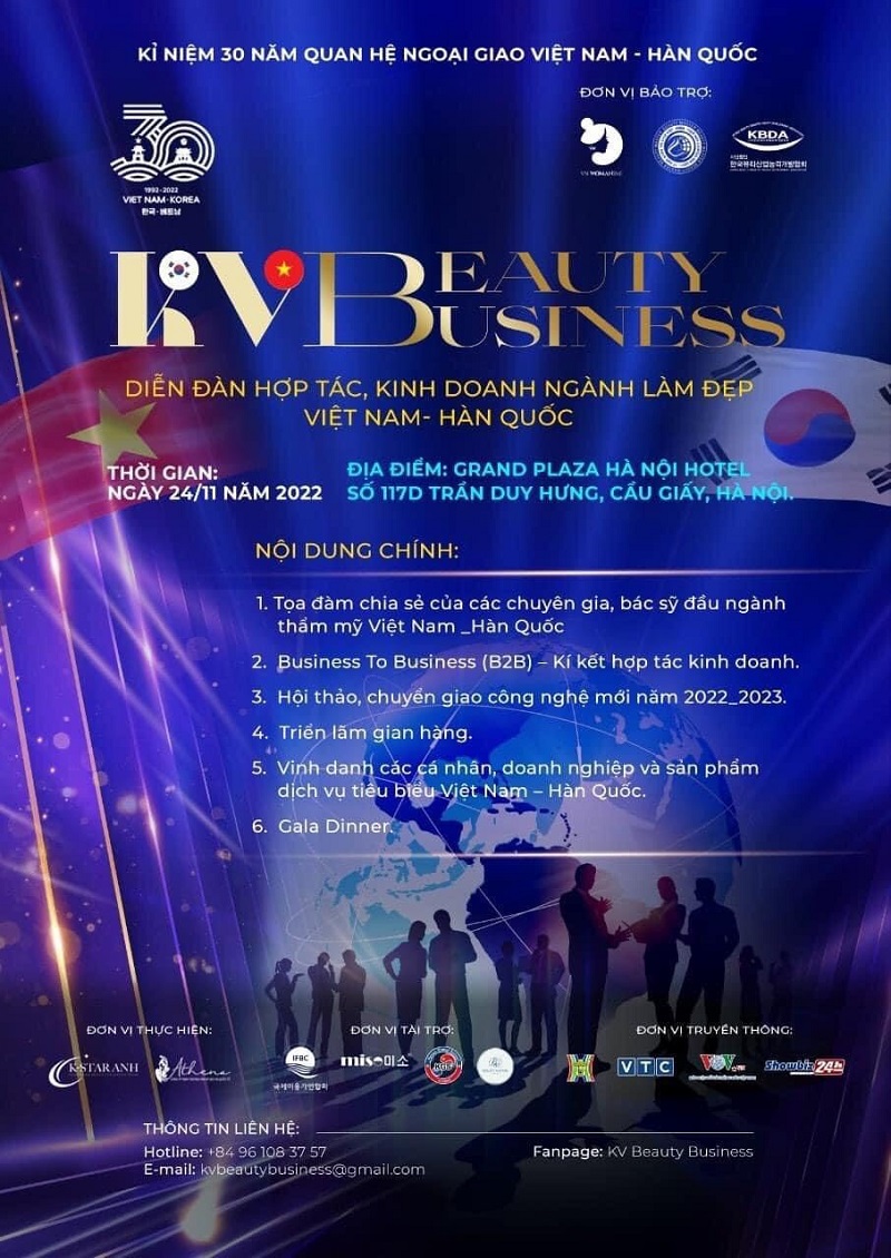 Diễn đàn hợp tác kinh doanh ngành làm đẹp Việt Nam - Hàn Quốc “KV BEAUTY BUSINESS 2022” là một chuỗi các sự kiện quan trọng trong lĩnh vực làm đẹp do Hiệp hội Doanh nghiệp Hàn Quốc tại Việt Nam – Korcham và Hiệp hội nữ Doanh nhân Doanh nghiệp nhỏ và vừa Việt Nam, Tổng hiệp hội liên đoàn thẩm mỹ quốc tế IFBC bảo trợ, đồng hành. Sự kiện ra đời nhằm hướng đến 30 năm thiết lập quan hệ Ngoại Giao Việt Nam - Hàn Quốc và thắt chặt tình hữu nghị của hai nước.