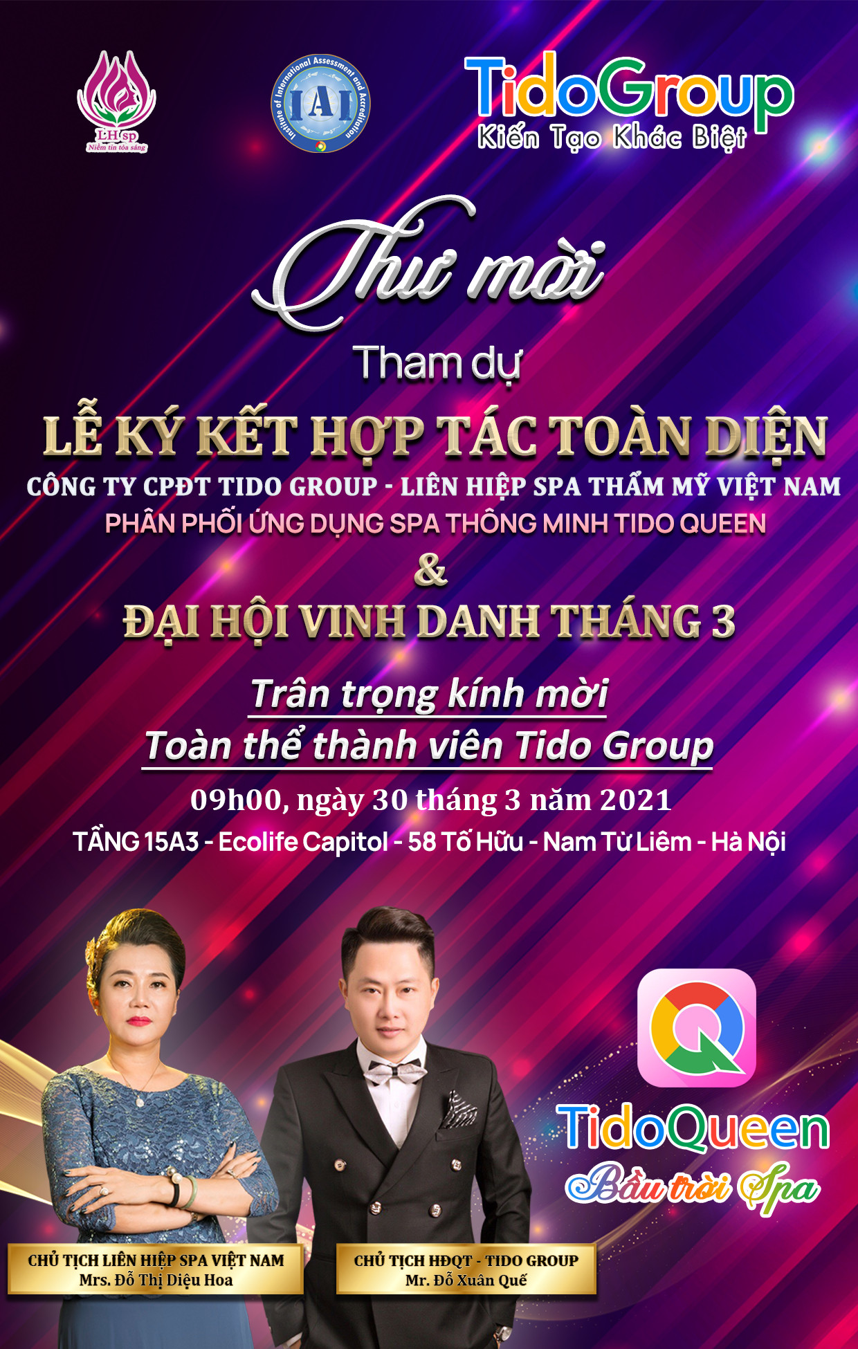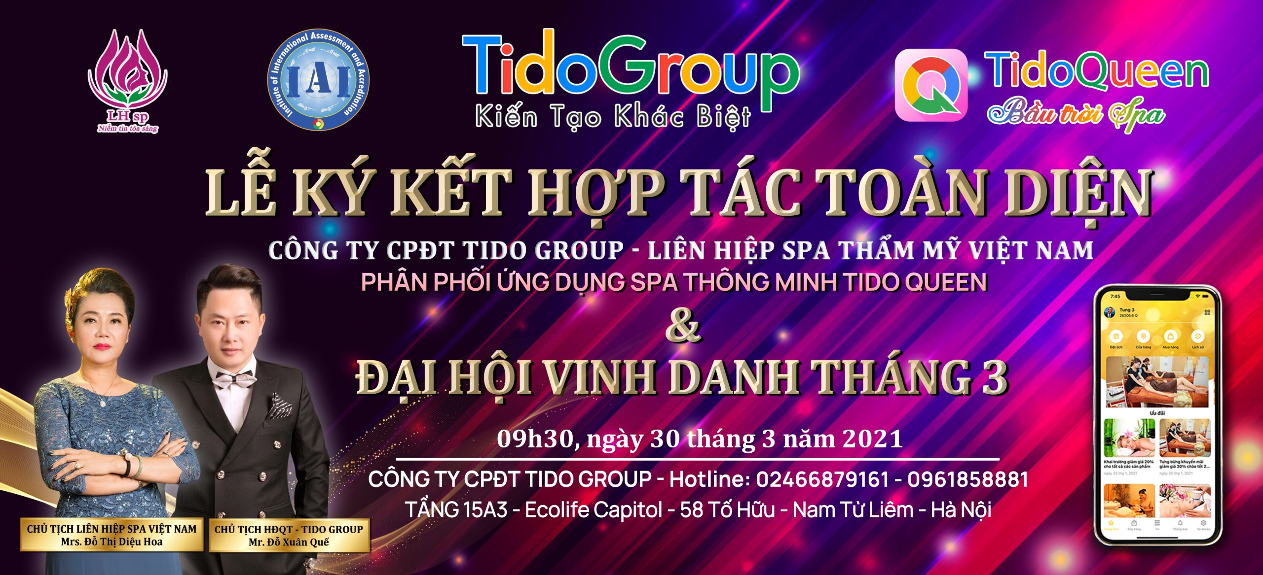 Vào sáng ngày 30 tháng 3 năm 2021, Liên hiệp spa thẩm mỹ Việt Nam có buổ lễ kí kết sản phẩm Tido Queen thuộc Tập đoàn Tido Group với vai trò là NHÀ PHÂN PHỐI TOÀN DIỆN . Đây là một sự kiện rất quan trọng cho việc tạo ra nền tảng phát triển và hỗ trợ kinh doanh của hội viên Liên hiệp spa thẩm mỹ VN trên toàn quốc.