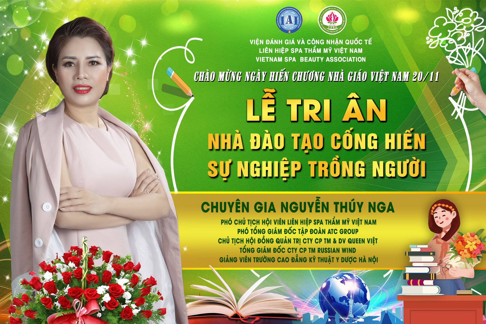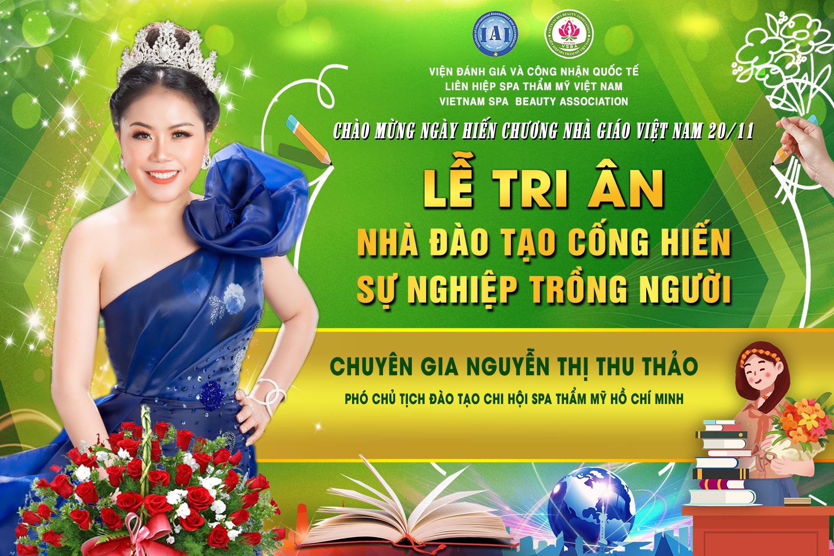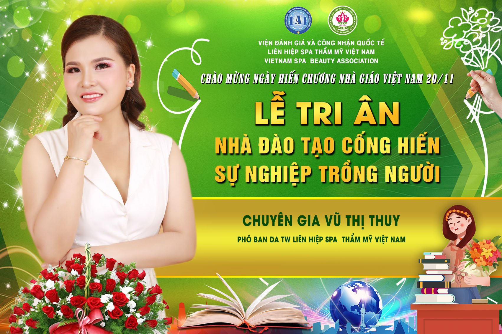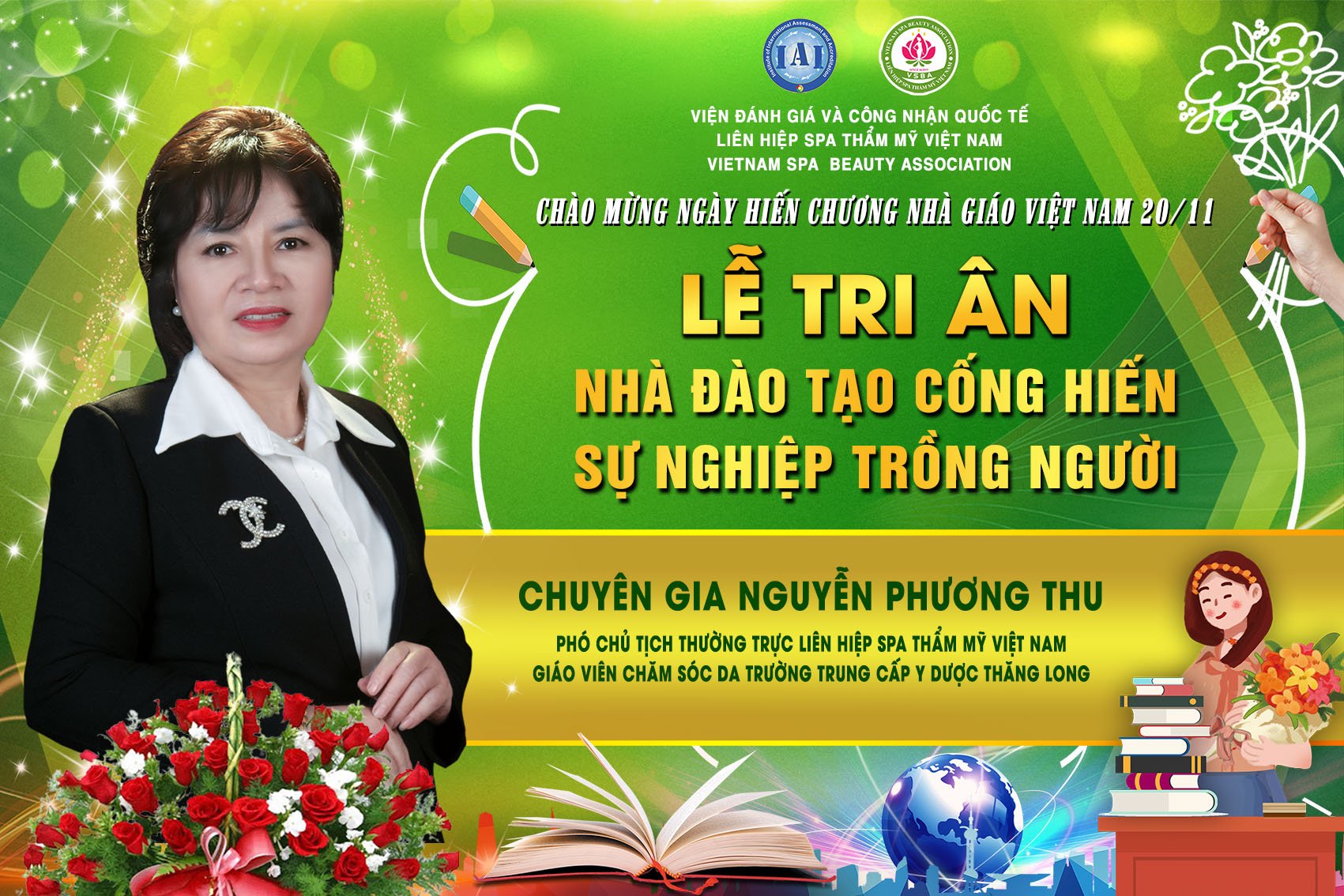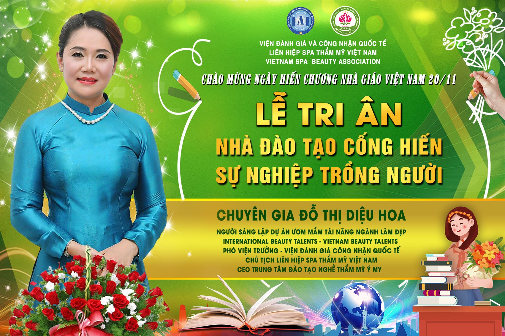 Để tri ân và chào mừng ngày hiến chương nhà giáo Việt Nam 20/11, Liên hiệp Spa thẩm mỹ Việt Nam đã tổ chức Lễ tri ân nhà đào tạo cống hiến sự nghiệp trồng người. Tham dự chương trình có sự hiện diện của chủ tịch Spa Thẩm mỹ Việt Nam Đỗ Thị Diệu Hoa cùng các chuyên gia, nhà đào tạo hàng đầu trong lĩnh vực làm đẹp.
