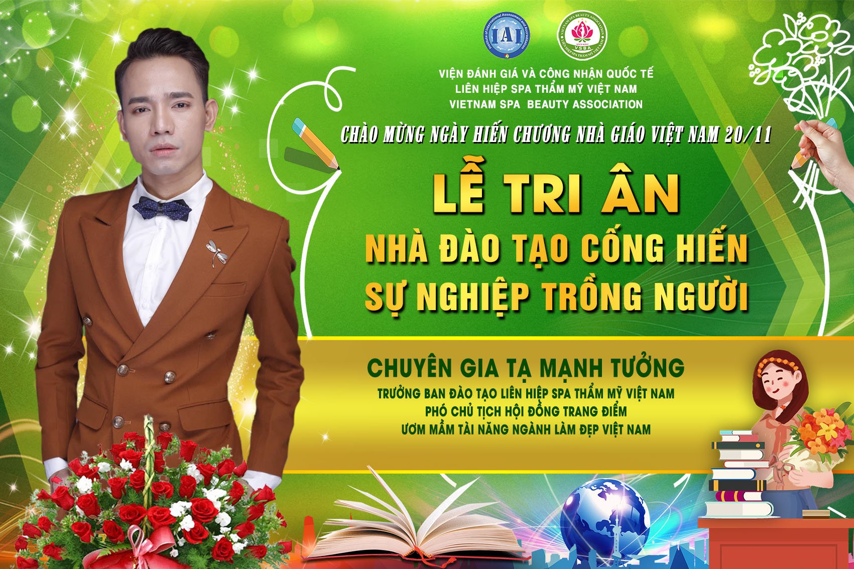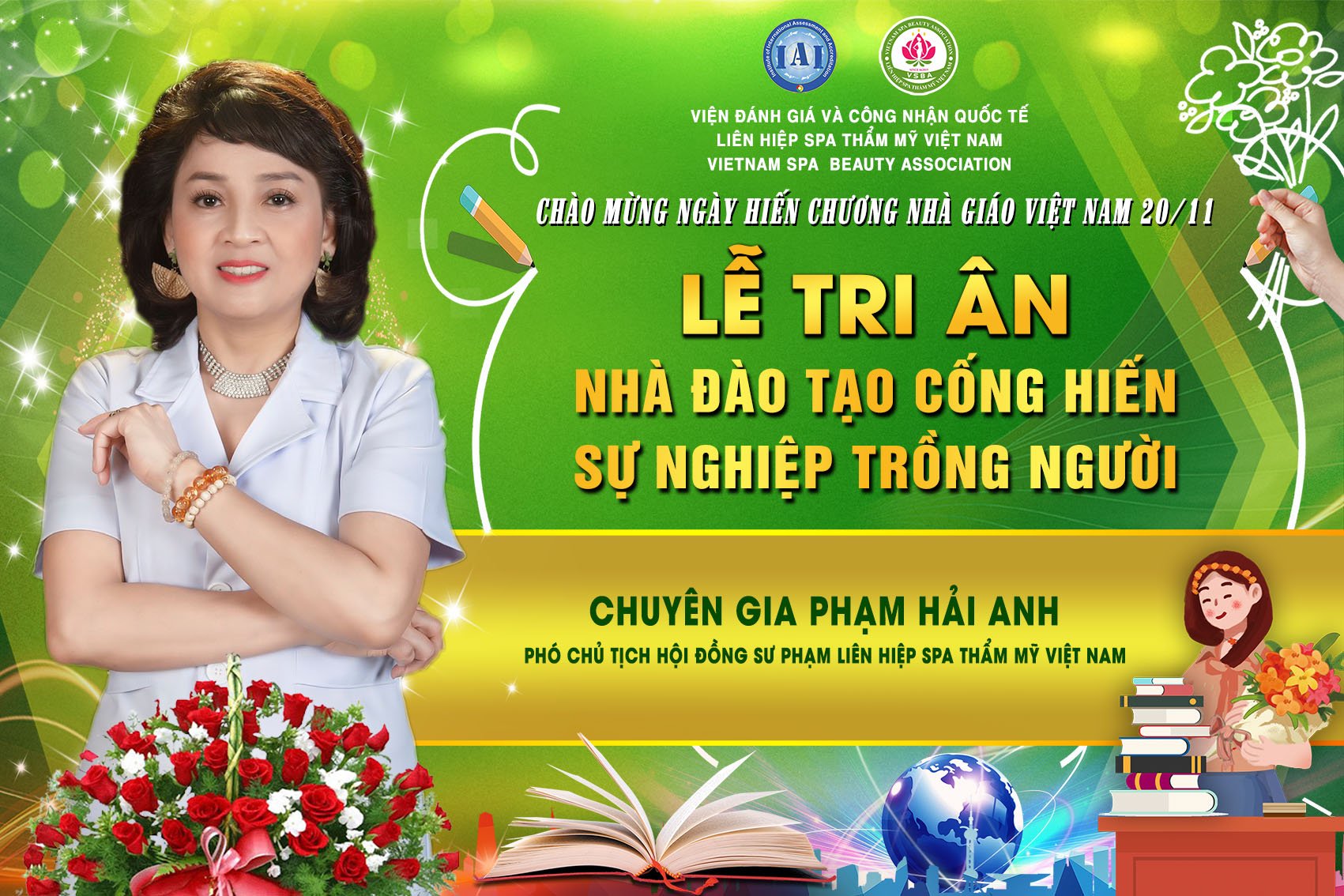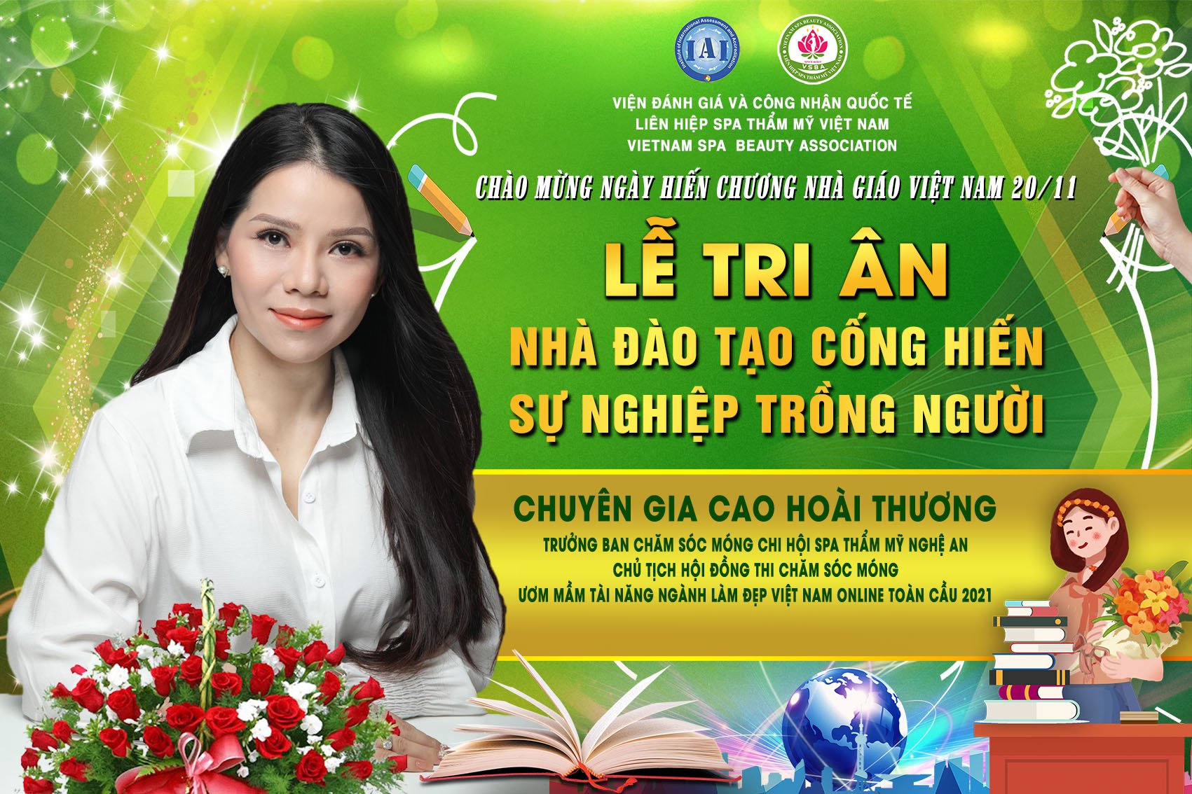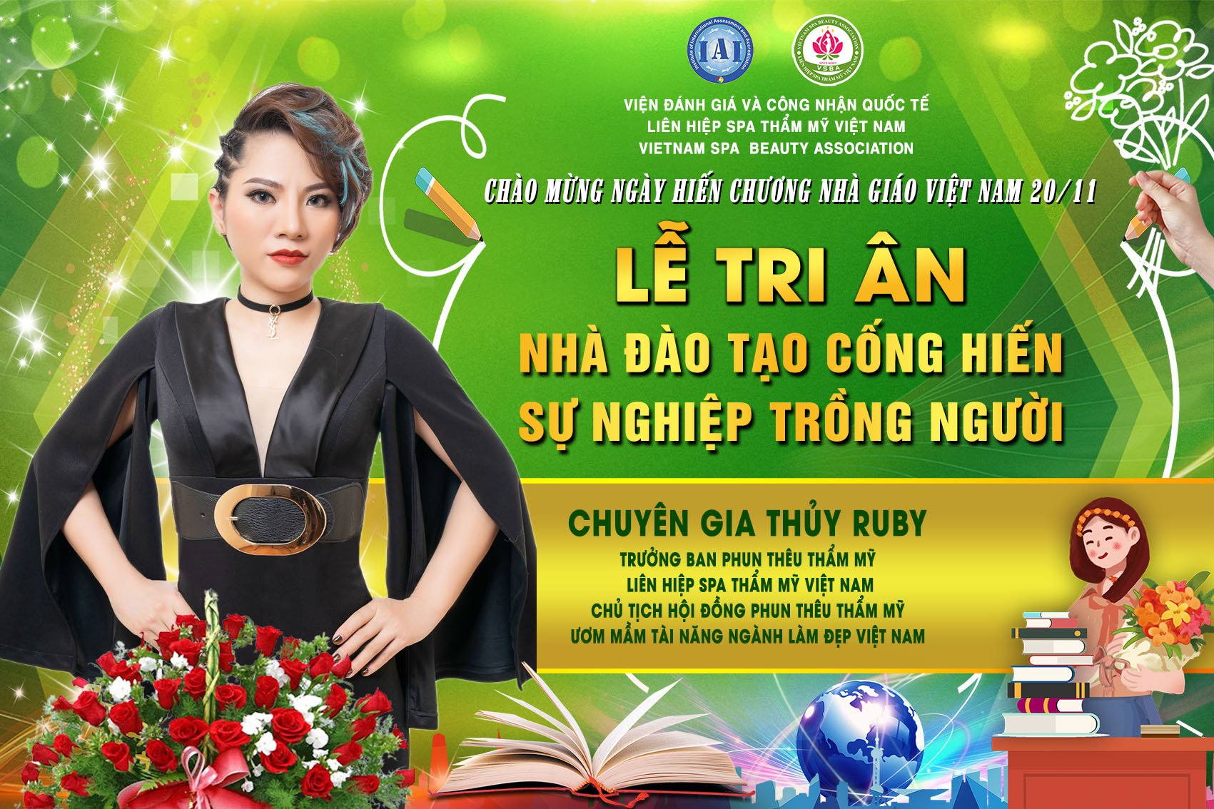 Để tri ân và chào mừng ngày hiến chương nhà giáo Việt Nam 20/11, Liên hiệp Spa thẩm mỹ Việt Nam đã tổ chức Lễ tri ân nhà đào tạo cống hiến sự nghiệp trồng người. Tham dự chương trình có sự hiện diện của chủ tịch Spa Thẩm mỹ Việt Nam Đỗ Thị Diệu Hoa cùng các chuyên gia, nhà đào tạo hàng đầu trong lĩnh vực làm đẹp.