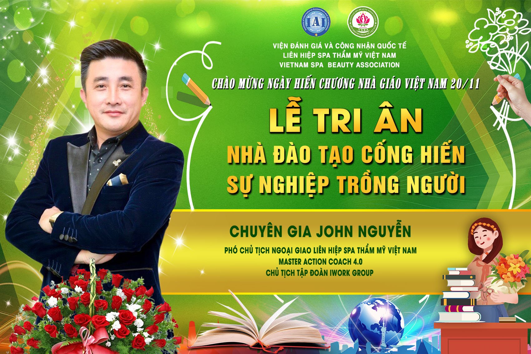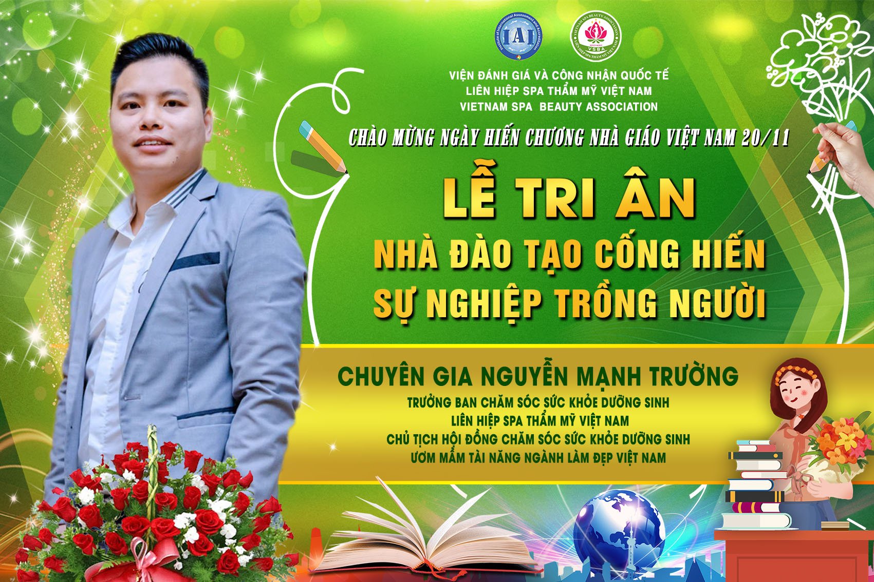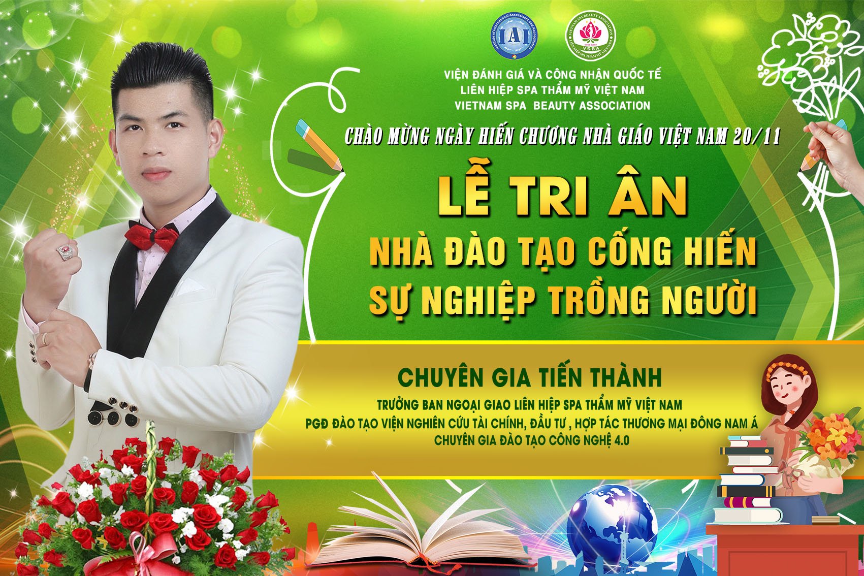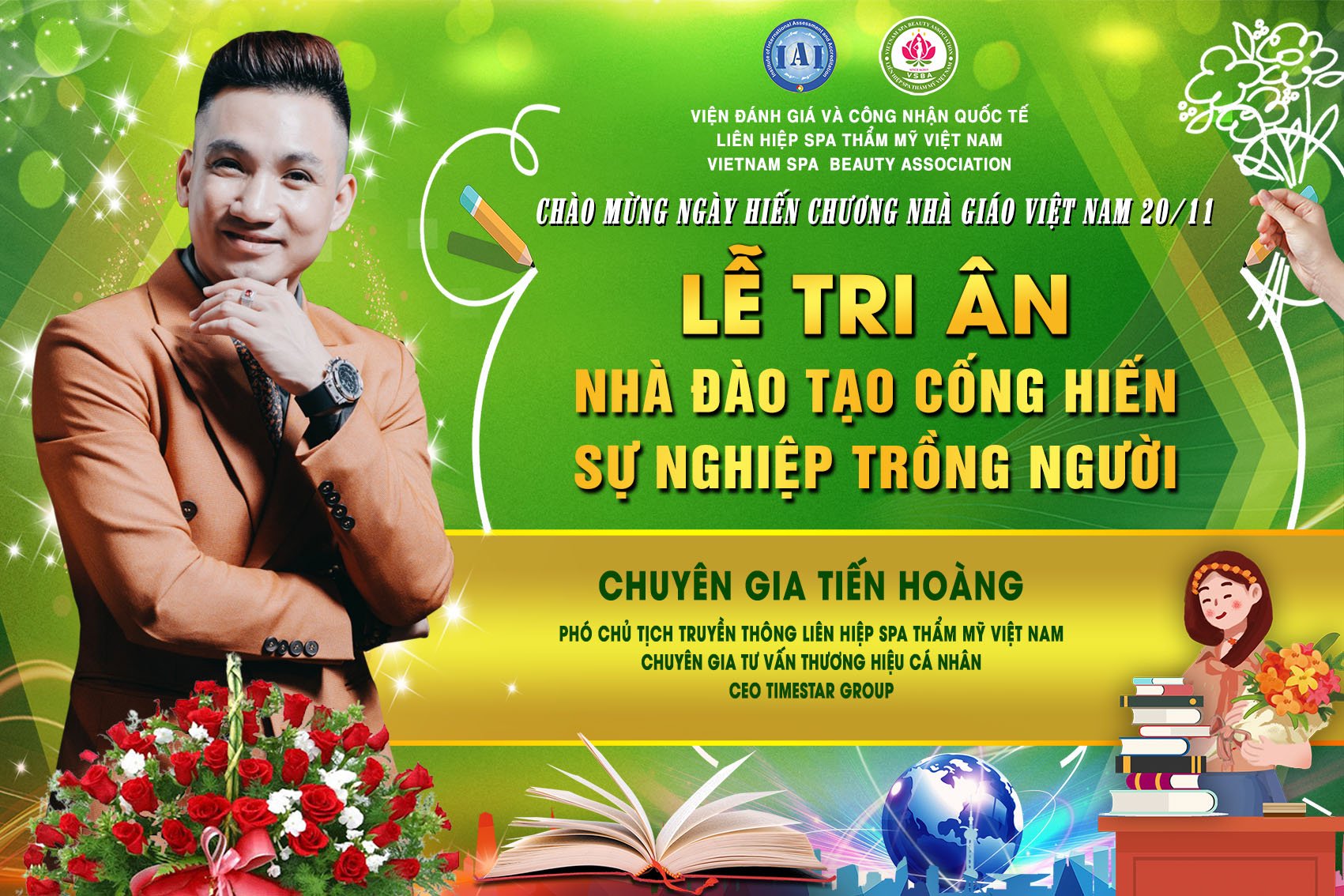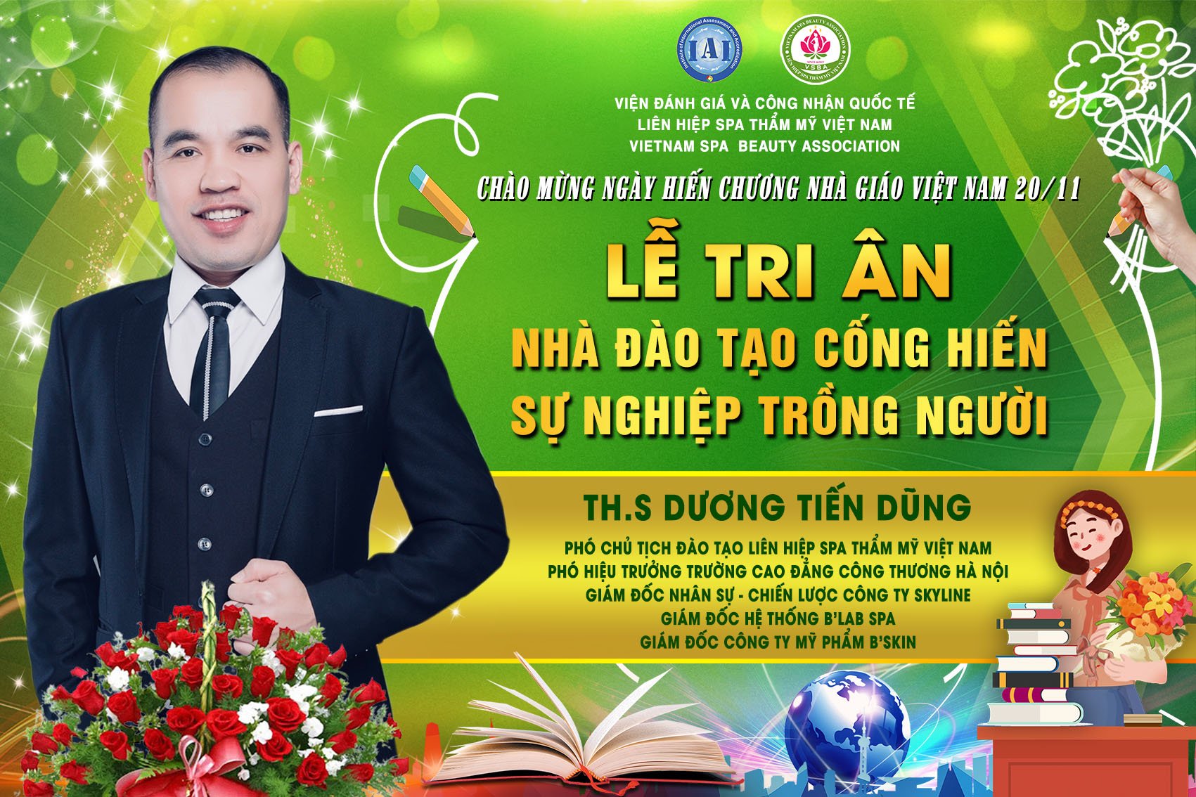 Để tri ân và chào mừng ngày hiến chương nhà giáo Việt Nam 20/11, Liên hiệp Spa thẩm mỹ Việt Nam đã tổ chức Lễ tri ân nhà đào tạo cống hiến sự nghiệp trồng người. Tham dự chương trình có sự hiện diện của chủ tịch Spa Thẩm mỹ Việt Nam Đỗ Thị Diệu Hoa cùng các chuyên gia, nhà đào tạo hàng đầu trong lĩnh vực làm đẹp.