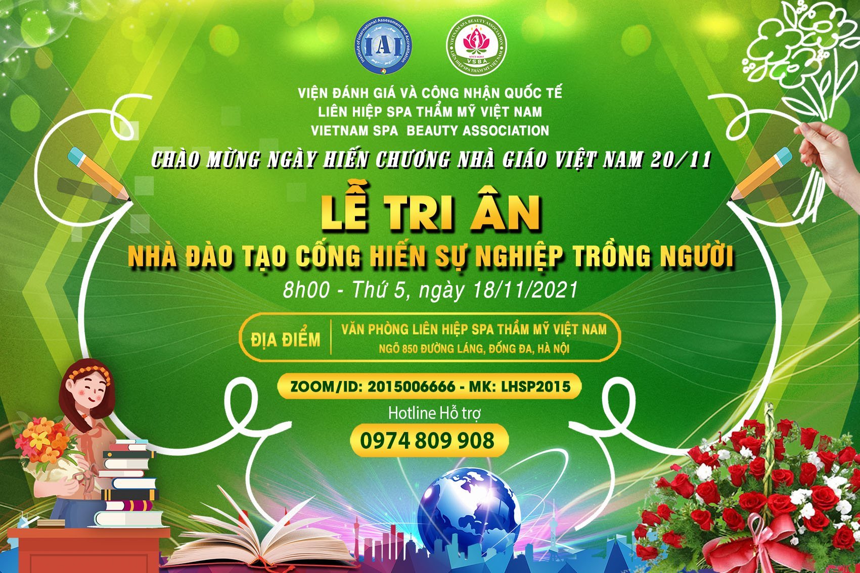 Vừa qua, vào 8h ngày 18/11/2021 tại Văn phòng Liên hiệp Spa Thẩm mỹ Việt Nam Ngõ 850 Đường Láng, Đống Đa, Hà Nội đã diễn ra Lễ tri ân nhà đào tạo cống hiến sự nghiệp trồng người. Sự kiện đồng thời diễn ra trên nền tảng Zoom Meeting ID: 2015006666 – MK: LHSP 2015.