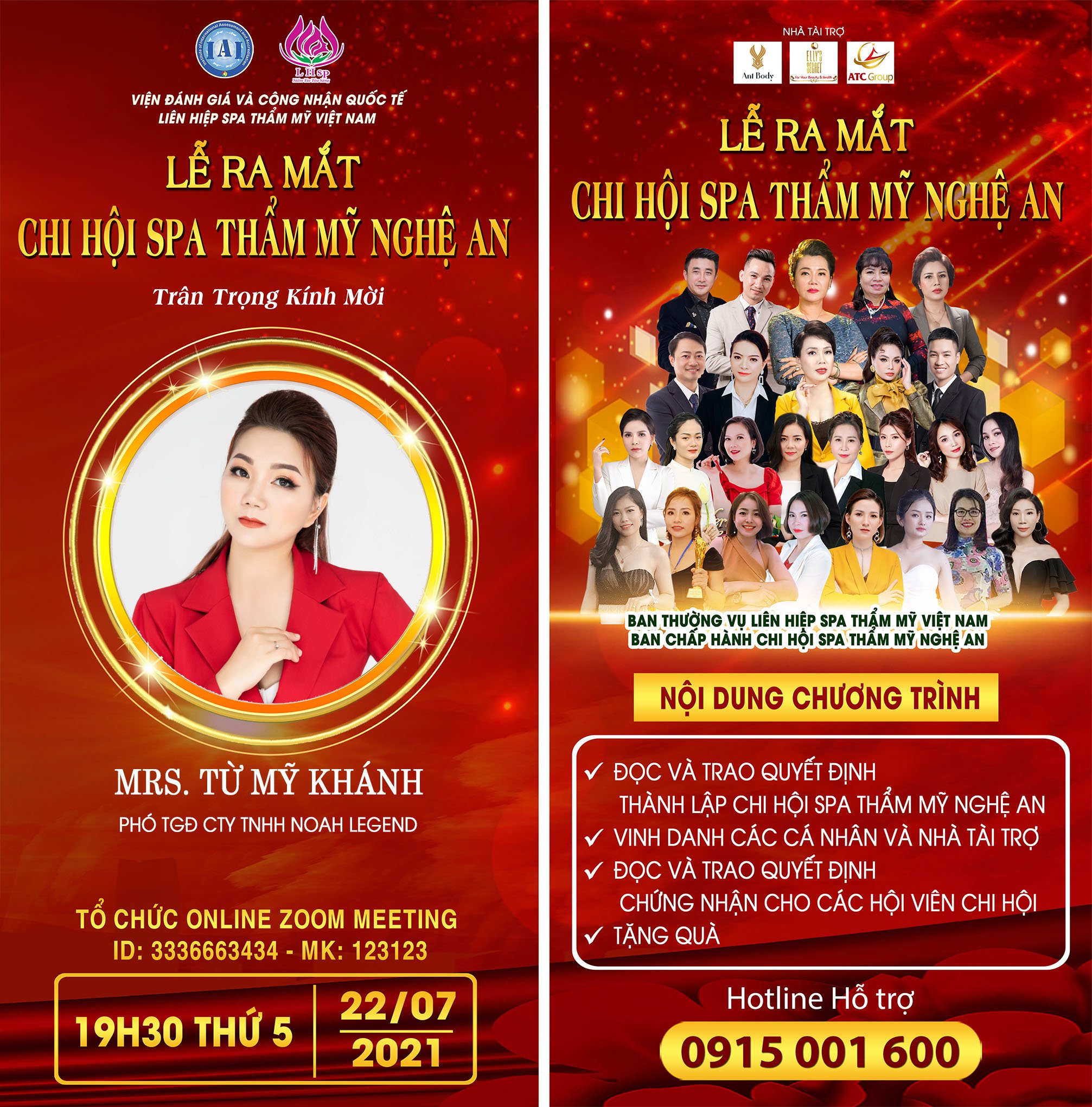 Sự kiện sẽ diễn ra vào 19h30 thứ 5, ngày 22/07/2021 trên Zoom Meeting, Id / Password: 3336663434 / 123123. Nội dung chương trình sẽ có 4 phần: Đọc và trao quyết định thành lập Chi hội Spa Thẩm mỹ Việt Nam; Vinh danh các cá nhân và nhà tài trợ; Đọc và trao quyết định chứng nhận cho các hội viên chi hội; Tặng quà.