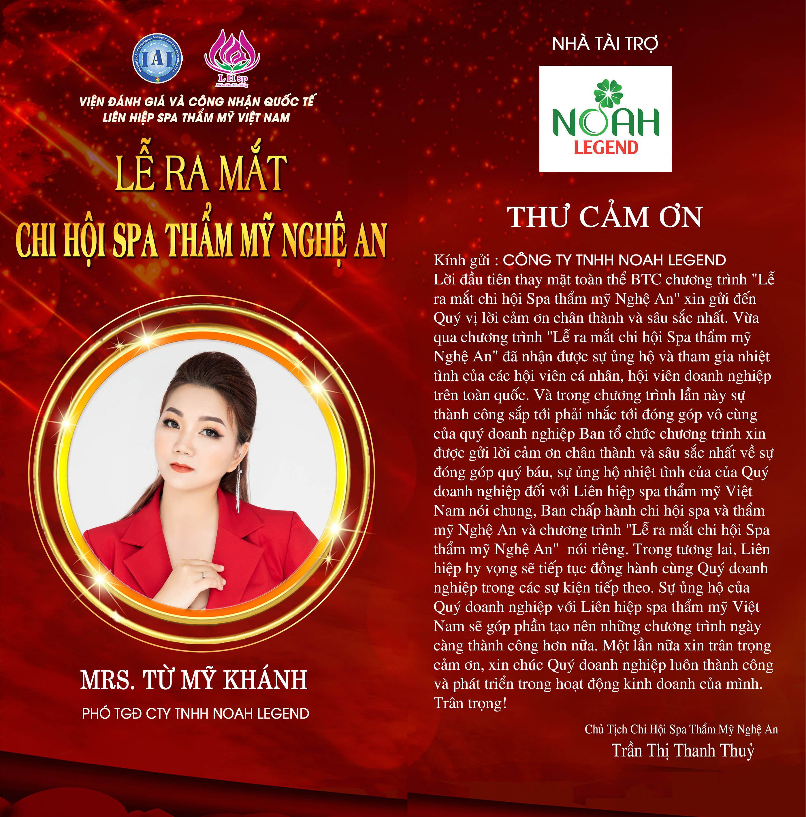 Không chỉ mang đến những giá trị đáng quý dành cho người Việt từ những sản phẩm tốt nhất. Noah Legend còn “chắp cánh” cho các sự kiện trong ngành làm đẹp trong những năm qua. Tại chương trình ra mắt của Chi hội spa Thẩm mỹ Nghệ An, bà Tạ Thị Thu Hằng sẽ tham dự trong vai trò Nhà tài trợ kim cương.