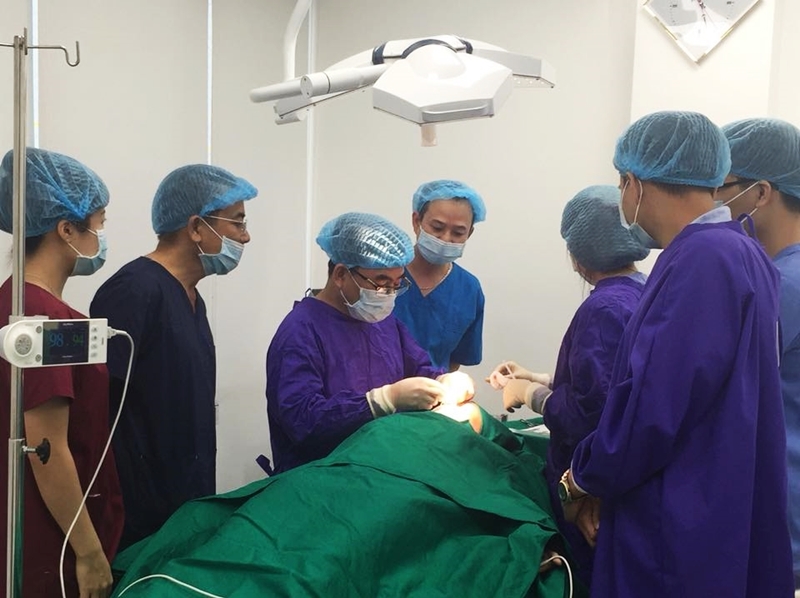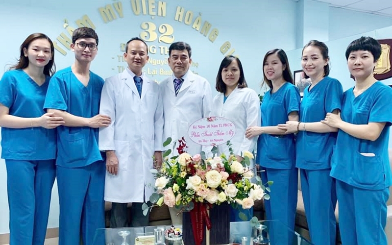 Bác sỹ Nguyễn Huy Thọ (áo trắng, bên phải), bác sỹ Lại Bình Nguyên (áo trắng, bên trái) cùng đội ngũ nhân viên tại Thẩm mỹ viện Hoàng Gia