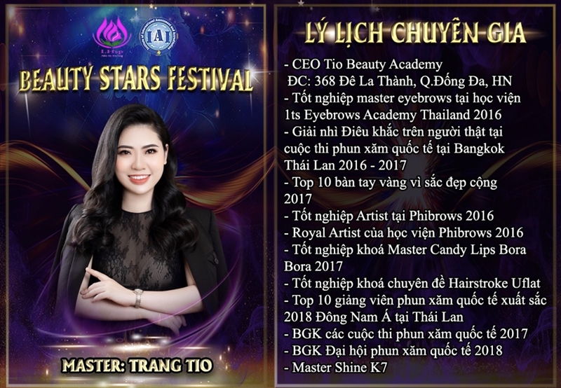 Tại Beauty Stars Festival, hơn 30 chuyên gia giỏi chuyên môn trong nhiều lĩnh vực như spa, thẩm mỹ, nail, thiết kế tạo mẫu tóc, trang điểm,...trên cả nước sẽ cùng hội tụ và tham gia biểu diễn tay nghề. Hãy cùng đón chờ sự xuất hiện của chuyên gia điêu khắc lông mày Trang Tio trong sự kiện chuyên nghiệp - đẳng cấp - độc đáo nhất ngành làm đẹp năm 2020 này!