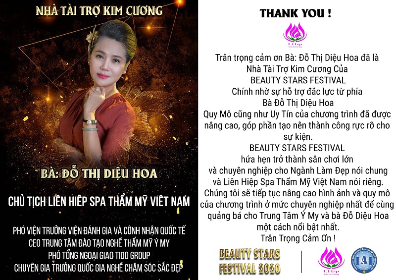Beauty Stars Festival xin chân thành cảm ơn sự tài trợ của chuyên gia Đỗ Thị Diệu Hoa. Chương trình hứa hẹn sẽ mang đến một sân chơi chuyên nghiệp, đẳng cấp của ngành Làm đẹp.